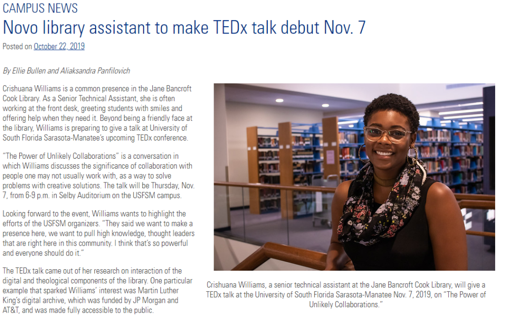 “Novo library assistant to make TEDx talk debut Nov. 7” New College News. By Ellie Bullen and Aliaksandra Panfilovich. Posted on October 22, 2019.
